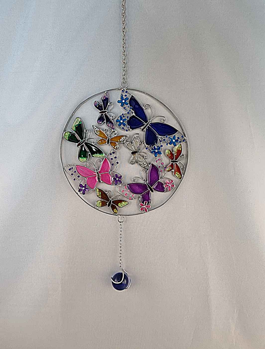Schöne Dekoration für das Fenster und den Wohnraum. Kombination aus Acrylglas, Metalleinrahmung und Kette mit Haken.