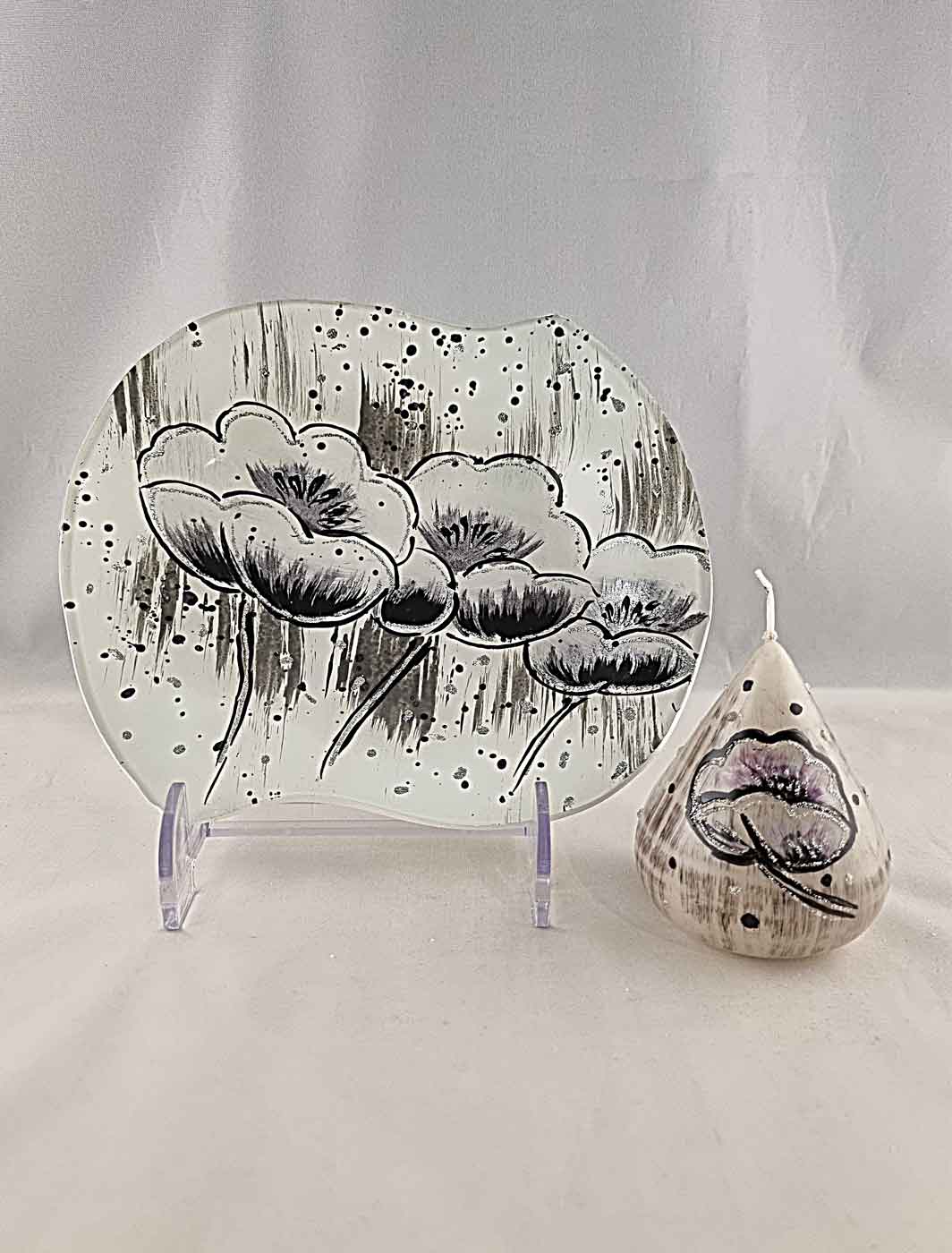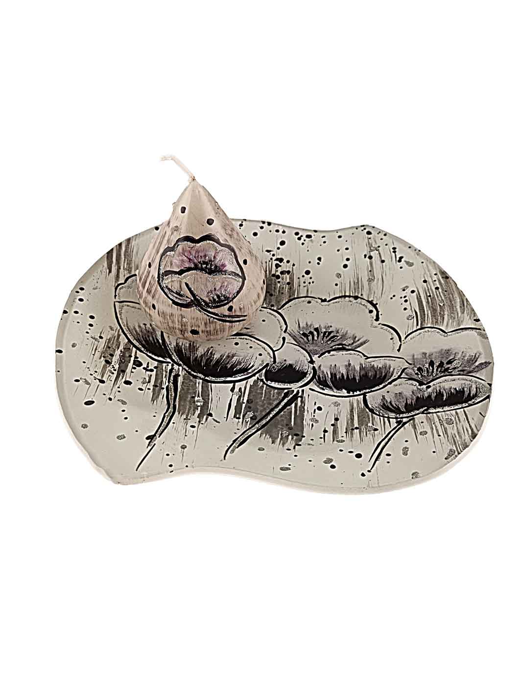Tischdekoration aus dekorierter Glasplatte und echter Wachskerze