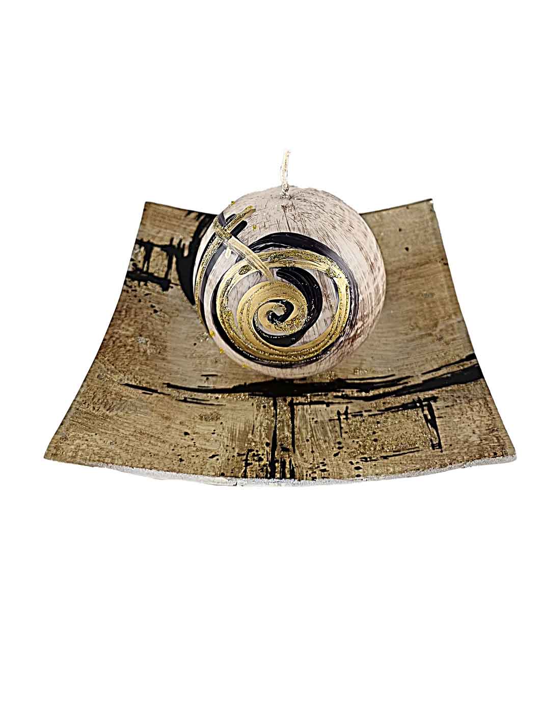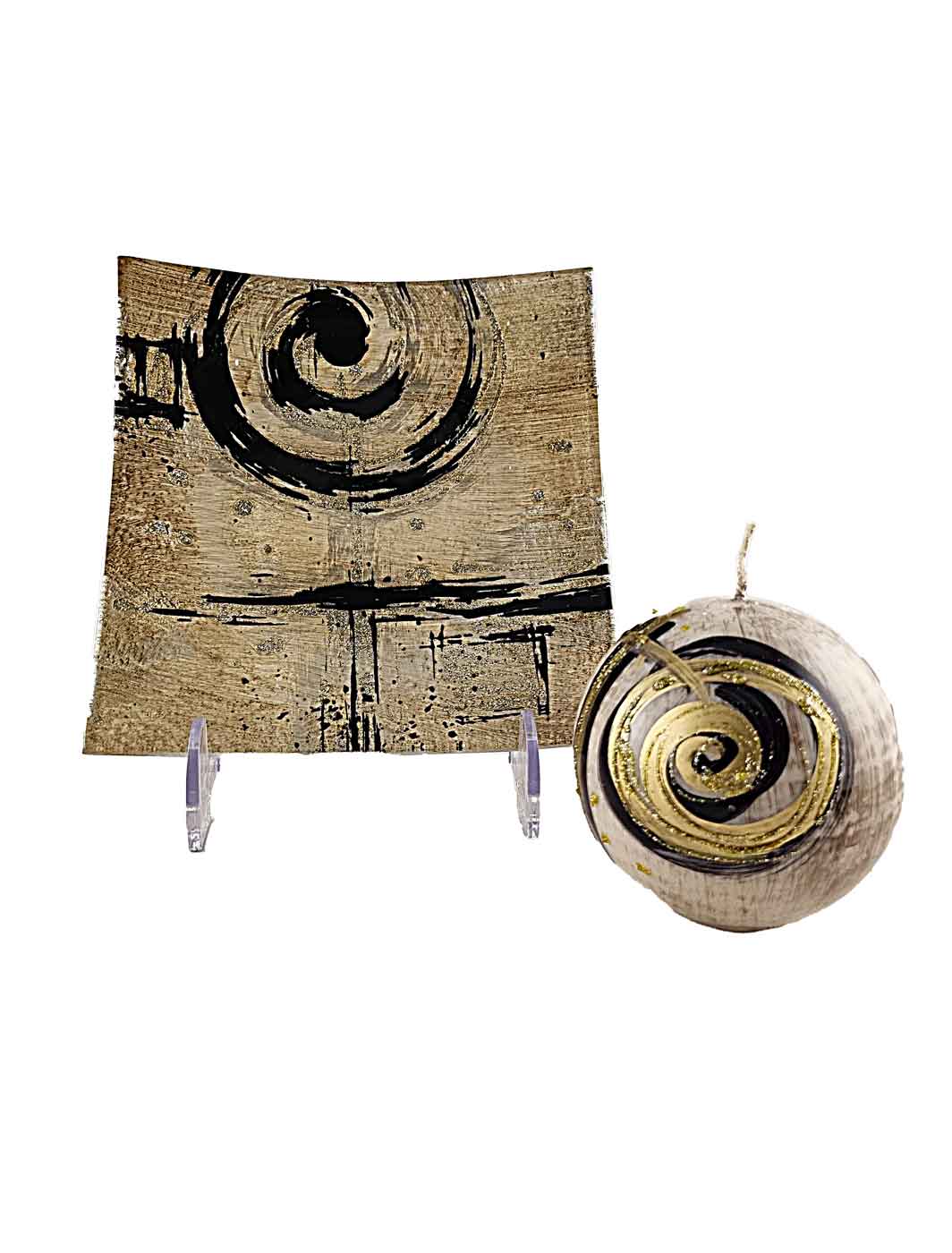 Tischdekoration aus dekorierter Glasplatte und echter Wachskerze