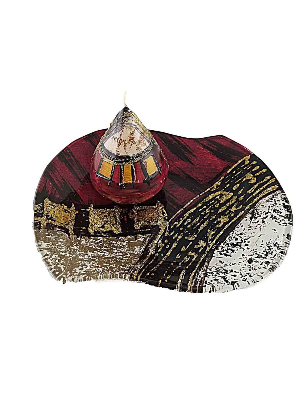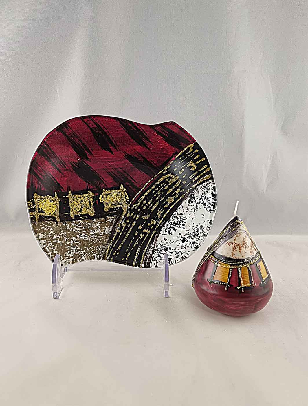 Tischdekoration aus dekorierter Glasplatte und echter Wachskerze