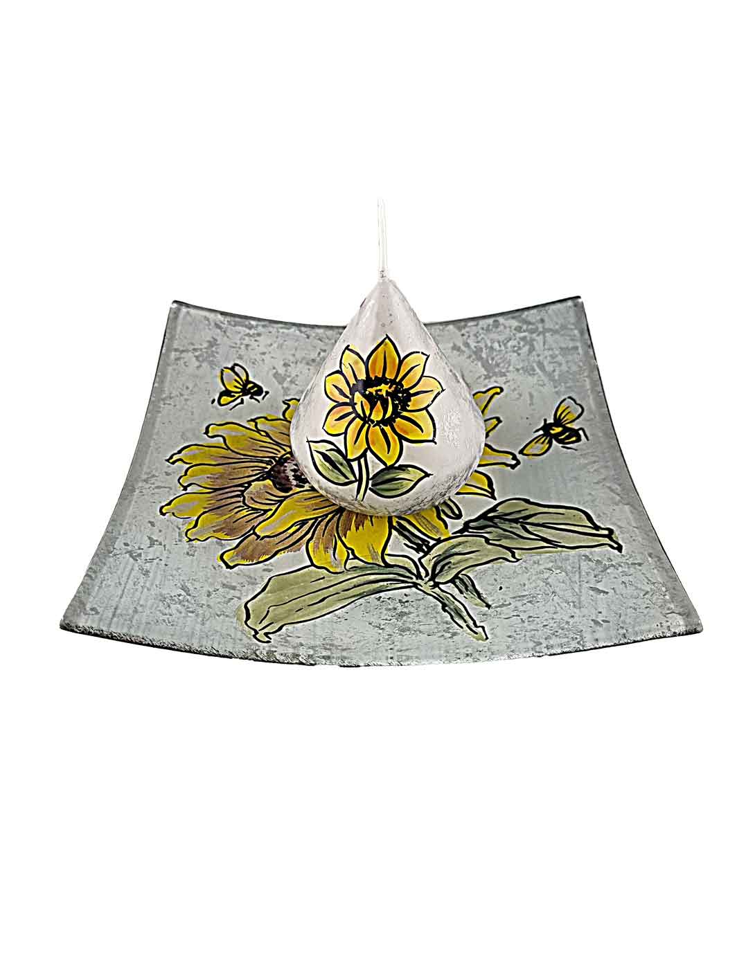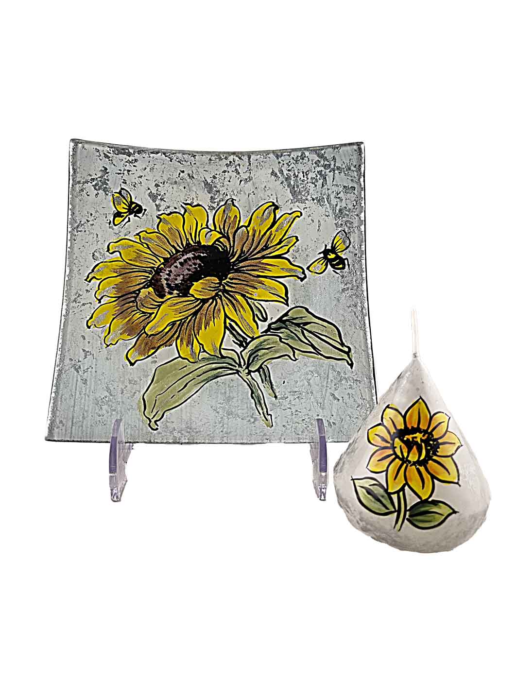 Tischdekoration aus dekorierter Glasplatte und echter Wachskerze