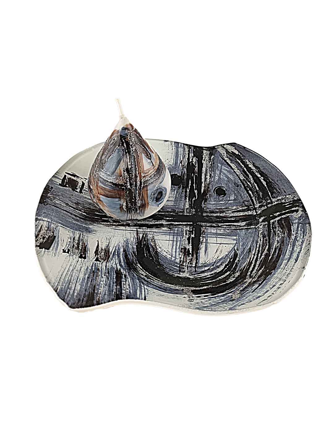 Tischdekoration aus dekorierter Glasplatte und echter Wachskerze